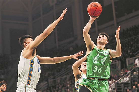 2月5日,在2023-2024賽季中國男子籃球職業(yè)聯(lián)賽(CBA)常規(guī)賽第39輪比賽中,遼寧本鋼隊主場113比85戰(zhàn)勝北京北汽隊。圖為遼寧本鋼隊球員鄢手騏(右)在比賽中投籃。