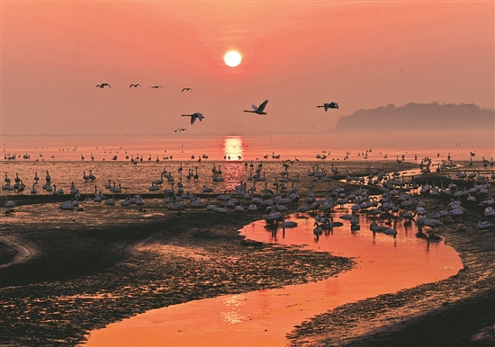 1月30日,山東省榮成市大天鵝國家級自然保護(hù)區(qū)濕地,成群大天鵝在朝陽下嬉戲、飛舞。楊志禮 攝/中新社