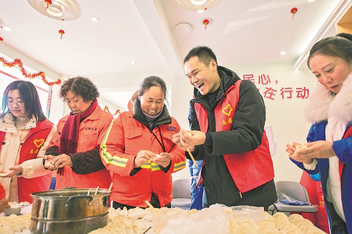 圖為志愿者們和環(huán)衛(wèi)工人代表一起貼春聯(lián)、貼新春飾品、包餃子、吃團(tuán)圓飯,在歡聲笑語中共同迎接龍年新春佳節(jié)。