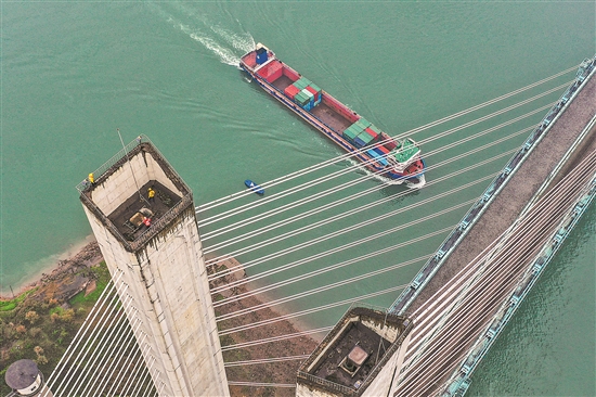 2月8日,橋隧工人在新白沙沱長江特大橋塔頂進(jìn)行檢查作業(yè)(無人機(jī)照片)。