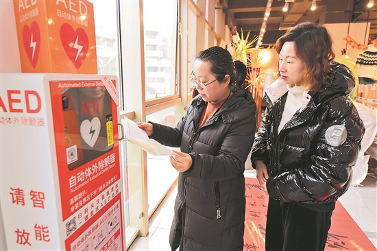 近日,建德市衛(wèi)健局工作人員(左)在商場內(nèi)查看AED設(shè)備維護(hù)記錄。