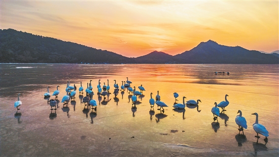 近日,西伯利亞遠途而來的白天鵝棲息在北京懷柔水庫,夕陽下形成一道美麗的風(fēng)景線。孫永東 攝/視覺中國