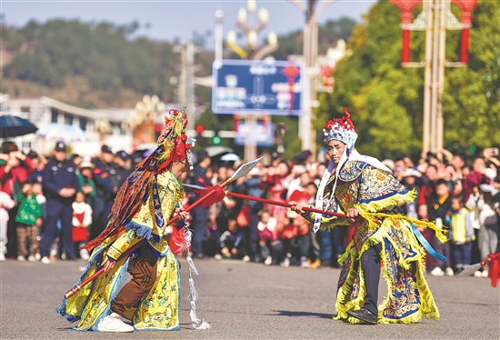 2月18日,人們?cè)谫F州省龍里縣民俗踩街活動(dòng)中表演太平花燈戲。