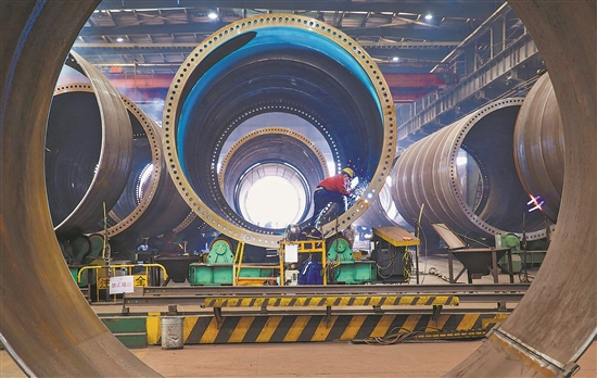 2月18日,江蘇連云港經(jīng)濟(jì)技術(shù)開發(fā)區(qū)一家風(fēng)電設(shè)備公司車間內(nèi),工人在生產(chǎn)風(fēng)電塔架。