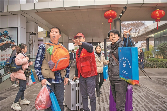 2月18日,浙江省鐵路金華站廣場上,金華市總工會和市人社局組織的志愿者引導(dǎo)來自貴州黔南州的返崗務(wù)工人員乘車分赴各市區(qū)縣企業(yè)。這是金華市今春首班返崗專列。為保障企業(yè)用工穩(wěn)就業(yè),2023年11月開始,金華市就派出工作組分別走訪在金勞動(dòng)力密集省份,提前謀劃對接春節(jié)前后返崗保障、用工服務(wù)、勞務(wù)合作等事項(xiàng)。本報(bào)通訊員 胡肖飛 攝