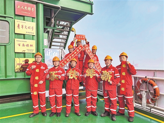 春節(jié)期間,中國(guó)石化勝利油田埕島中心三號(hào)平臺(tái)的班組職工堅(jiān)守生產(chǎn)一線,全力保障節(jié)日期間海上油氣生產(chǎn)安全平穩(wěn)運(yùn)行。圖為除夕,埕島中心三號(hào)平臺(tái)的職工給大家拜年。 張燦 攝