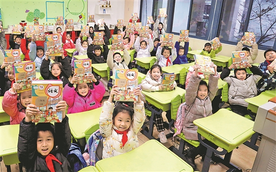 2月20日,在江蘇省蘇州市金閶實(shí)驗小學(xué)校,小學(xué)生展示領(lǐng)到的新學(xué)期課本。