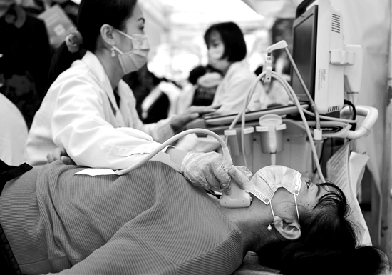 在重慶,一次義診中,醫(yī)護(hù)人員正在為一位市民進(jìn)行甲狀腺癌篩查。周毅 攝/中新社