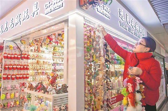 2月21日,義烏國(guó)際商貿(mào)城經(jīng)營(yíng)戶整理展示樣品。