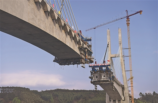 2月21日,在南深高鐵南玉段六律邕江特大橋建設(shè)現(xiàn)場(chǎng),工人在建設(shè)施工中。