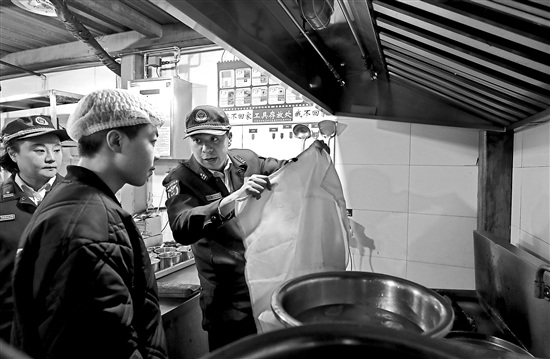 當日,上海市長寧區(qū)消防救援支隊對轄區(qū)內餐飲行業(yè)進行消防安全檢查,支隊消防指導組成員對餐飲店內的消防設施器材、燃氣使用、疏散通道、電器線路敷設以及油煙管道內油垢清理情況等進行排查,現(xiàn)場幫扶指導,清除火災隱患。 新華社記者 方喆 攝