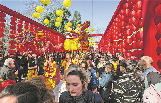 日前,意大利羅馬舉行彩妝巡游、舞龍表演、書法體驗等歡度春節(jié)的活動,吸引眾多市民、游客前來體驗中國文化,共同慶祝龍年春節(jié)。圖為近日在意大利羅馬維多利奧公園,人們觀看彩妝巡游。新華社記者 李京 攝