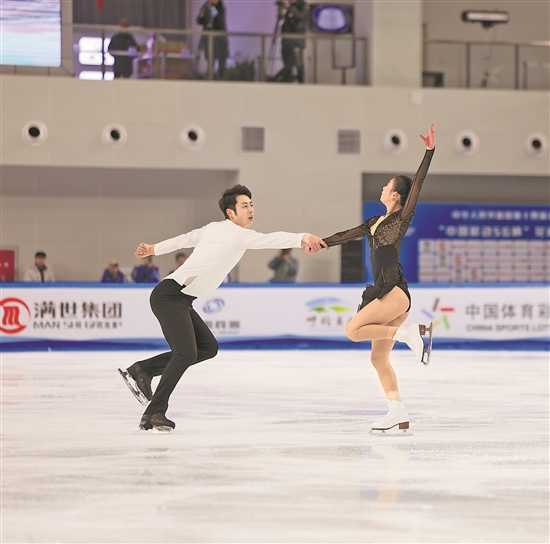 2月25日,北京隊(duì)組合彭程(右)/王磊奪得雙人滑自由滑冠軍。本報(bào)記者 蔚可任 攝