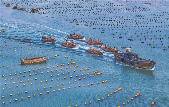 春節(jié)剛過,在山東省榮成市的各個海洋牧場里,養(yǎng)殖船來往穿梭,養(yǎng)殖工人緊張作業(yè),一派海上“春耕”的繁忙景象。