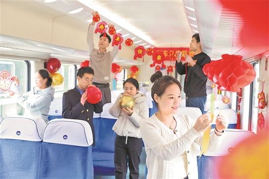2月23日,為了讓旅客感受元宵節(jié)日氣息,中國(guó)鐵路鄭州局集團(tuán)有限公司鄭州客運(yùn)段北京一隊(duì)K180/179次列車工作人員精心裝扮車廂。他們自編自演,為旅客準(zhǔn)備了歌曲、小品、猜燈謎等文藝節(jié)目和游戲。本報(bào)通訊員 張建峰 攝