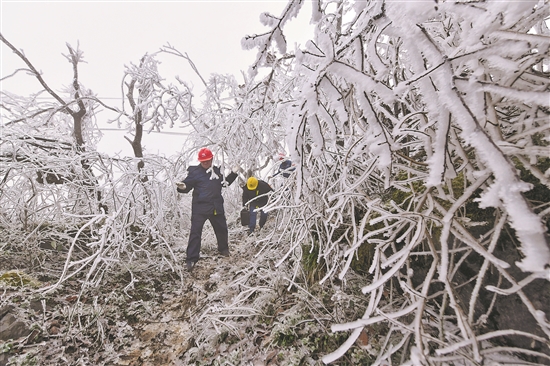連日來,受冷空氣影響,廣西桂北高寒山區(qū)出現(xiàn)低溫雨雪冰凍天氣,導(dǎo)致電力線路覆冰,當(dāng)?shù)貑?dòng)低溫雨雪冰凍災(zāi)害Ⅲ級應(yīng)急響應(yīng)。新華社記者 黃孝邦 攝