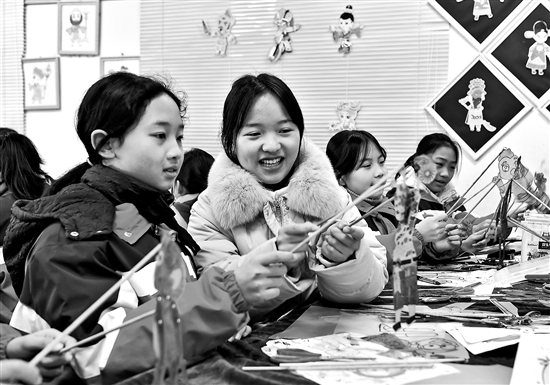 2月26日,四川省廣安市前鋒區(qū)代市小學(xué)的學(xué)生在老師的指導(dǎo)下學(xué)習(xí)皮影戲表演技巧。