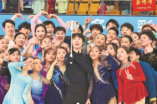2月27日,“十四冬”花樣滑冰表演滑在內(nèi)蒙古呼倫貝爾市內(nèi)蒙古冰上運(yùn)動訓(xùn)練中心舉行。圖為表演滑結(jié)束后,運(yùn)動員們在賽場合影。本報記者 蔚可任 攝