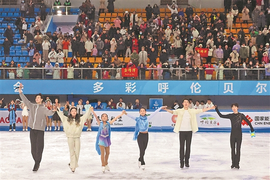 2月27日,“十四冬”花樣滑冰表演滑在內(nèi)蒙古呼倫貝爾市內(nèi)蒙古冰上運(yùn)動訓(xùn)練中心舉行。圖為表演滑結(jié)束后,運(yùn)動員們向觀眾致意。 本報記者 蔚可任 攝