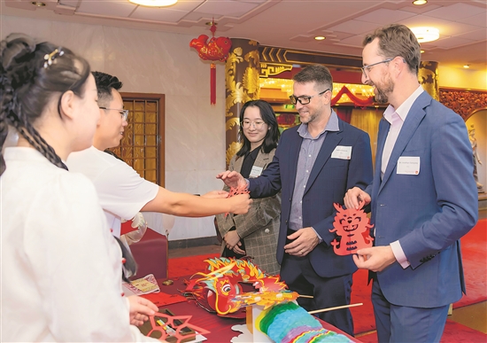 當(dāng)?shù)貢r(shí)間2月27日,在澳大利亞堪培拉中國駐澳大利亞大使館,來賓欣賞中國剪紙藝術(shù)。新華社發(fā)(儲(chǔ)晨 攝)