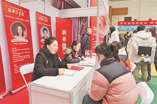 為進一步促進北京“23·7”特大暴雨受災(zāi)地區(qū)勞動力盡快就業(yè),2月28日,北京市人力資源和社會保障局在門頭溝區(qū)和房山區(qū)同步舉辦2024年春風(fēng)行動進社區(qū)專場招聘會。本次招聘會為當(dāng)?shù)厝罕娝蛵徫?、送培?xùn)、送服務(wù),提供崗位近5000個。圖為門頭溝區(qū)專場招聘會現(xiàn)場。本報記者 賴志凱 攝