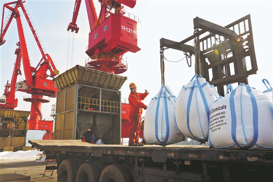 2月27日,在江蘇連云港港口碼頭,工人將卸下的化肥裝車。