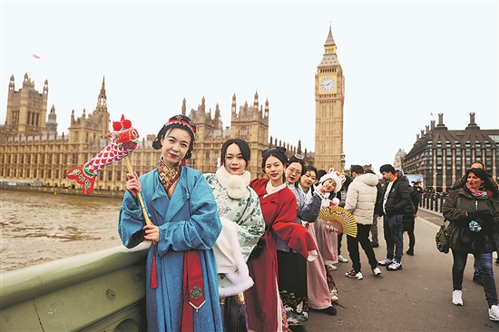 日前,一些漢服愛(ài)好者身著漢服來(lái)到英國(guó)倫敦的泰晤士河畔和大英博物館,向當(dāng)?shù)孛癖姾陀慰徒榻B中國(guó)春節(jié),宣傳中華傳統(tǒng)文化。圖為近日漢服愛(ài)好者在英國(guó)倫敦大本鐘前展示漢服。新華社記者 李穎 攝