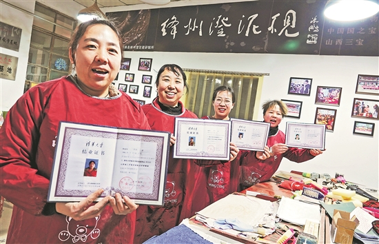 2月28日,制硯工藝師李金玲(左一)和姐妹們展示在清華大學(xué)進(jìn)修的結(jié)業(yè)證書(shū)?!叭恕眹?guó)際婦女節(jié)將至,在“中國(guó)澄泥硯之都”山西省運(yùn)城市新絳縣絳州澄泥硯文化產(chǎn)業(yè)園生產(chǎn)基地,幾十名家門(mén)口就近就業(yè)的農(nóng)家婦女制硯工藝師,大顯絕活絕技,在快樂(lè)勞動(dòng)中喜迎節(jié)日。本報(bào)通訊員 高新生 攝