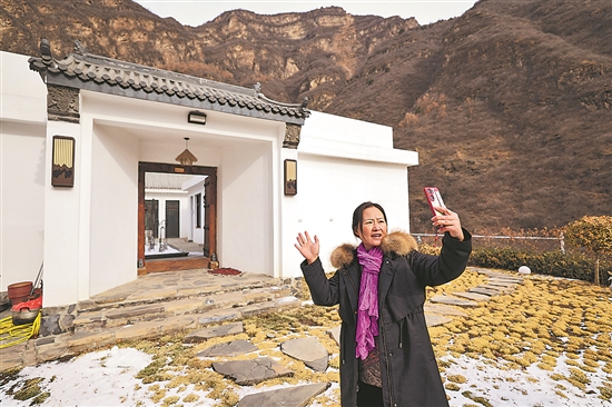 民宿經(jīng)營(yíng)者在天津前干澗村的自家民宿前用手機(jī)錄制短視頻進(jìn)行推介。