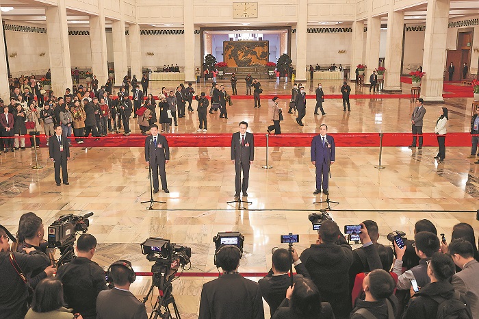 3月4日,全國(guó)政協(xié)十四屆二次會(huì)議首場(chǎng)“委員通道”集體采訪活動(dòng)在北京人民大會(huì)堂舉行。圖為全國(guó)政協(xié)委員韓保江、郭吉安、葉聰(從左至右)接受記者采訪。本報(bào)記者 吳凡 攝