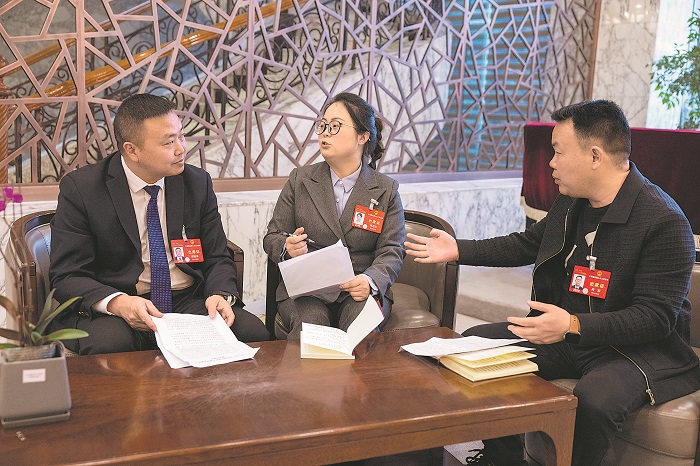 3月4日,在貴州代表團(tuán)駐地,六盤(pán)水市水城區(qū)農(nóng)業(yè)農(nóng)村局植保站站長(zhǎng)楊恩蘭代表(圖中)與兩名村委會(huì)主任鄭培坤代表(圖左)、肖軍代表(圖右)就各自的建議進(jìn)行交流。今年全國(guó)兩會(huì)上,他們?cè)谌绾胃玫赝苿?dòng)鄉(xiāng)村振興、保障糧食安全等方面有著共同的話題。