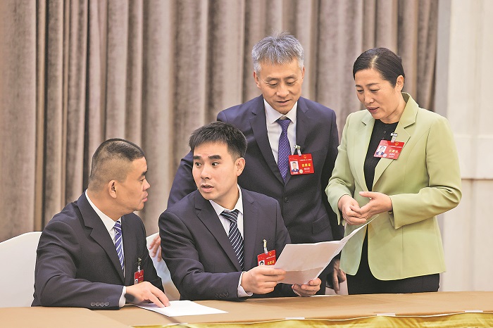 3月5日,在河北代表團(tuán)駐地,冀中能源峰峰集團(tuán)新屯礦機電區(qū)副區(qū)長顧博代表(左二)與北京建工三建機電分公司水電安裝隊隊長譚雙劍代表(左一)、邯鄲市農(nóng)業(yè)科學(xué)院生物技術(shù)中心主任楊保新代表(左三)、保定市清苑區(qū)南王莊瓜果蔬菜專業(yè)合作社理事長李素環(huán)代表在討論政府工作報告。