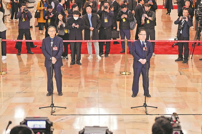 3月5日上午,十四屆全國(guó)人大二次會(huì)議首場(chǎng)“代表通道”開(kāi)啟。圖為云岡研究院院長(zhǎng)杭侃代表(圖左)、中國(guó)社科院考古所安陽(yáng)站副站長(zhǎng)何毓靈代表接受媒體采訪。本報(bào)記者 王偉偉 攝