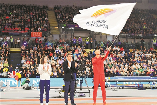 北京時(shí)間3月4日,在英國(guó)格拉斯哥舉行的2024年室內(nèi)田徑世錦賽閉幕。圖為中國(guó)田徑運(yùn)動(dòng)員王嘉男(右)在會(huì)旗交接儀式上揮舞世界田聯(lián)旗幟。2025年室內(nèi)田徑世錦賽將在中國(guó)南京舉行。新華社記者 李穎 攝