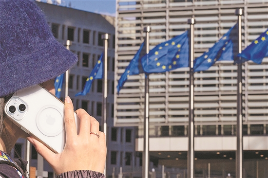 近日,一名女子在比利時(shí)布魯塞爾歐盟委員會(huì)總部前使用蘋果手機(jī)。歐洲聯(lián)盟委員會(huì)3月4日對美國蘋果公司處罰18.4億歐元,理由是蘋果在流媒體音樂業(yè)務(wù)中有壟斷行為。歐盟的調(diào)查緣于瑞典流媒體音樂服務(wù)商聲田公司2019年針對蘋果公司提出的反壟斷投訴。新華社記者 孟鼎博 攝