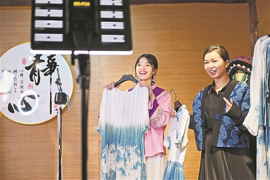 李利(右)在貴州省興義市萬(wàn)峰林景區(qū)門(mén)店內(nèi)與員工一起進(jìn)行線(xiàn)上銷(xiāo)售(2月19日攝)。