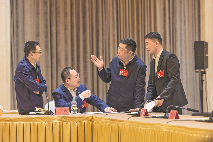 3月8日,在黑龍江代表團小組會議結(jié)束后,通用技術(shù)齊齊哈爾第二機床有限責(zé)任公司配套分廠精密車間馬恒昌小組組長馬兵代表(右二)找到中車齊齊哈爾車輛有限公司貨車分廠電焊高級技師、高級工程師王海代表(左二),就馬兵代表提出的關(guān)于深化產(chǎn)業(yè)工人隊伍建設(shè)改革,增強勞模工匠榮譽感、自豪感的建議展開討論。同行的哈爾濱紅光鍋爐集團環(huán)縫焊接組組長周曉龍代表(右一)和龍煤集團鶴崗礦業(yè)公司峻德礦山電氣設(shè)備維護安裝公司黨支部書記兼經(jīng)理許曉林代表(左一)聽到后也加入討論。