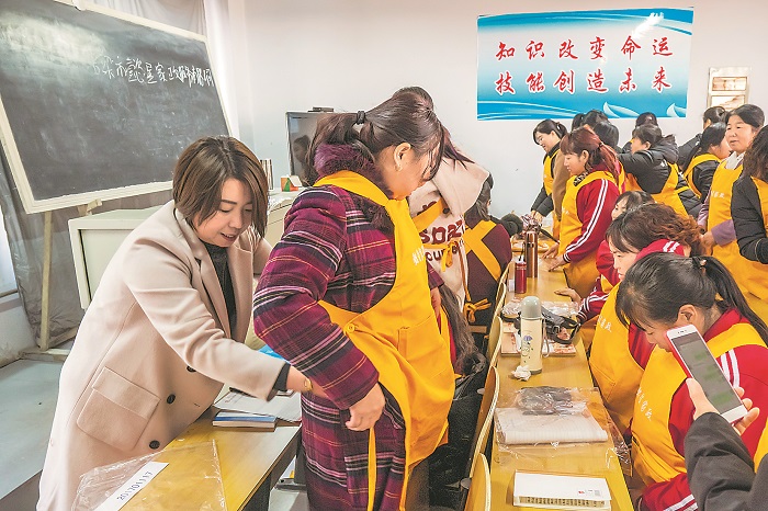 山西呂梁,馬金蓮代表(左一)在自己創(chuàng)辦的家政公司培訓班上,幫護工學員系圍裙。