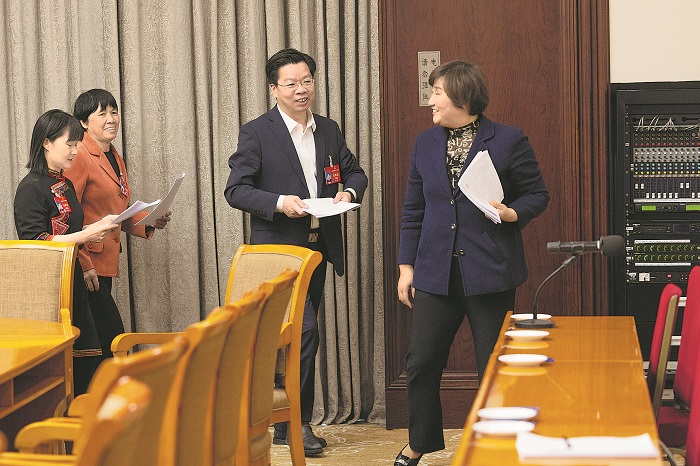 3月9日,在福建代表團駐地,廈門集裝箱碼頭集團有限公司黨委委員、工會主席馮鴻昌代表(右二)與佳好佳(福建)生態(tài)環(huán)境科技有限公司環(huán)衛(wèi)項目管理員侯艷梅代表(右一)、永安市小陶鎮(zhèn)八一片區(qū)黨委書記許光園代表(左二)、福安市康厝畬族鄉(xiāng)金斗洋村黨支部書記鐘團玉代表在會后交流。