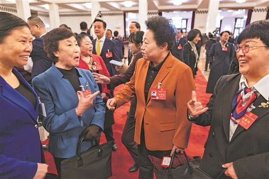 3月8日,參加全國(guó)兩會(huì)的女代表互致節(jié)日祝福。當(dāng)陜西代表團(tuán)馬紅麗代表(右一)問山西代表團(tuán)郭鳳蓮代表(左二)的年齡時(shí),郭鳳蓮代表伸出手指表示自己近80歲了。