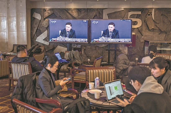 3月6日,十四屆全國(guó)人大二次會(huì)議舉行經(jīng)濟(jì)主題記者會(huì)。圖為全國(guó)兩會(huì)新聞中心休息區(qū)。