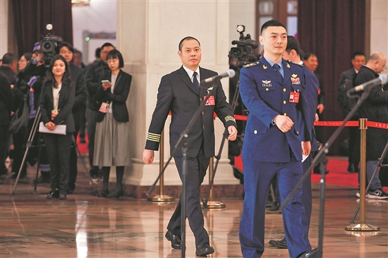3月5日,殲-20飛行員高中強(qiáng)代表(右一)與“英雄機(jī)長(zhǎng)”劉傳建代表“同框”走上首場(chǎng)“代表通道”。