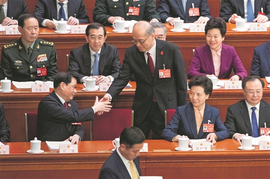 3月8日上午,北京人民大會(huì)堂,最高人民法院院長(zhǎng)張軍向大會(huì)作完最高人民法院工作報(bào)告后,最高人民檢察院檢察長(zhǎng)應(yīng)勇(前排左一)與他握手致意。