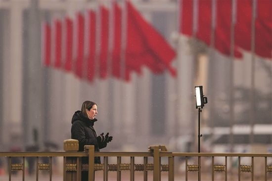 3月5日,十四屆全國(guó)人大二次會(huì)議在京開幕。開幕會(huì)開始前,一名外媒記者在天安門廣場(chǎng)做出鏡報(bào)道。