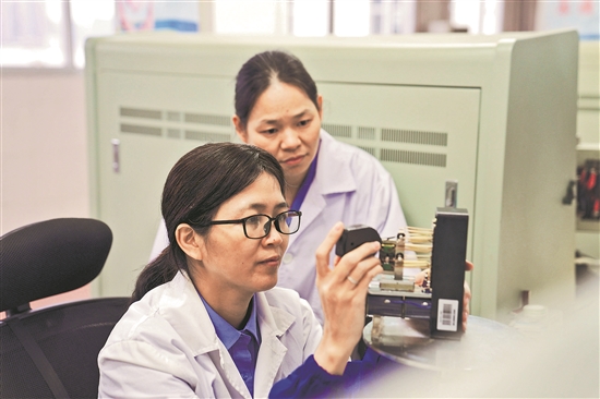 圖為3月4日,高珠(左)和蒙小花在測試繼電器零部件參數(shù)。李鈺丹 文 袁俊杰 攝