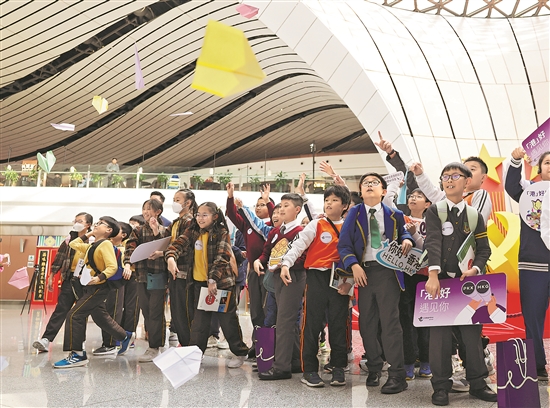 3月12日,搭乘香港快運(yùn)航空首航航班抵京的香港中小學(xué)生參觀團(tuán)在大興國際機(jī)場航站樓內(nèi)參加活動。