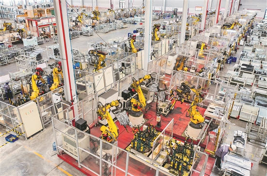 在位于浙江省湖州市長興經(jīng)濟(jì)技術(shù)開發(fā)區(qū)的長興地通汽車部件有限公司,全自動機(jī)器人高速運(yùn)轉(zhuǎn)生產(chǎn)新能源汽車配件訂單產(chǎn)品。
