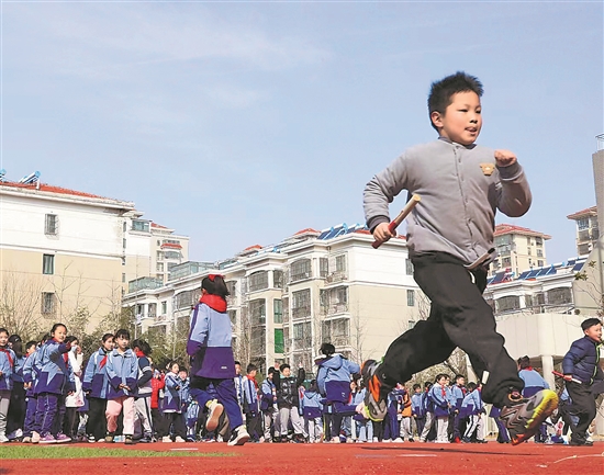 3月13日,江蘇省連云港市海州區(qū)孔望山小學(xué),小學(xué)生在30分鐘大課間參加戶外活動(dòng)。第8個(gè)全國近視防控宣傳教育月活動(dòng)近日啟動(dòng),強(qiáng)調(diào)要確保中小學(xué)生課間正?;顒?dòng),讓學(xué)生有更多時(shí)間到戶外活動(dòng)和望遠(yuǎn)。本報(bào)通訊員 耿玉和 攝