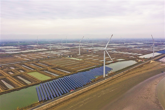 圖為3月14日拍攝的江蘇啟東龍源風(fēng)電場10萬千瓦項目。近年來,在國網(wǎng)江蘇電力的積極服務(wù)下,江蘇海上風(fēng)電裝機已達1183萬千瓦,每年為長三角地區(qū)持續(xù)輸送約306億千瓦時的清潔能源,相當于南京約半年的用電量,厚植江蘇綠色低碳發(fā)展底色。