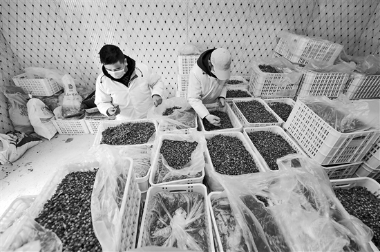 在四川道孚縣農(nóng)特產(chǎn)品加工園區(qū)內(nèi)的一家食品公司凍庫里,工人在篩選用于制作飲料的變?nèi)~海棠果實(3月10日攝)。